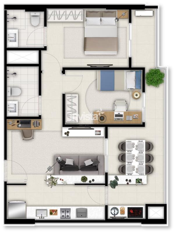O imóvel possui 72,87 m² de área interna, distribuídos em 2 dormitórios, sendo 1 suíte, além de 2 banheiros e 1 vaga de garagem.