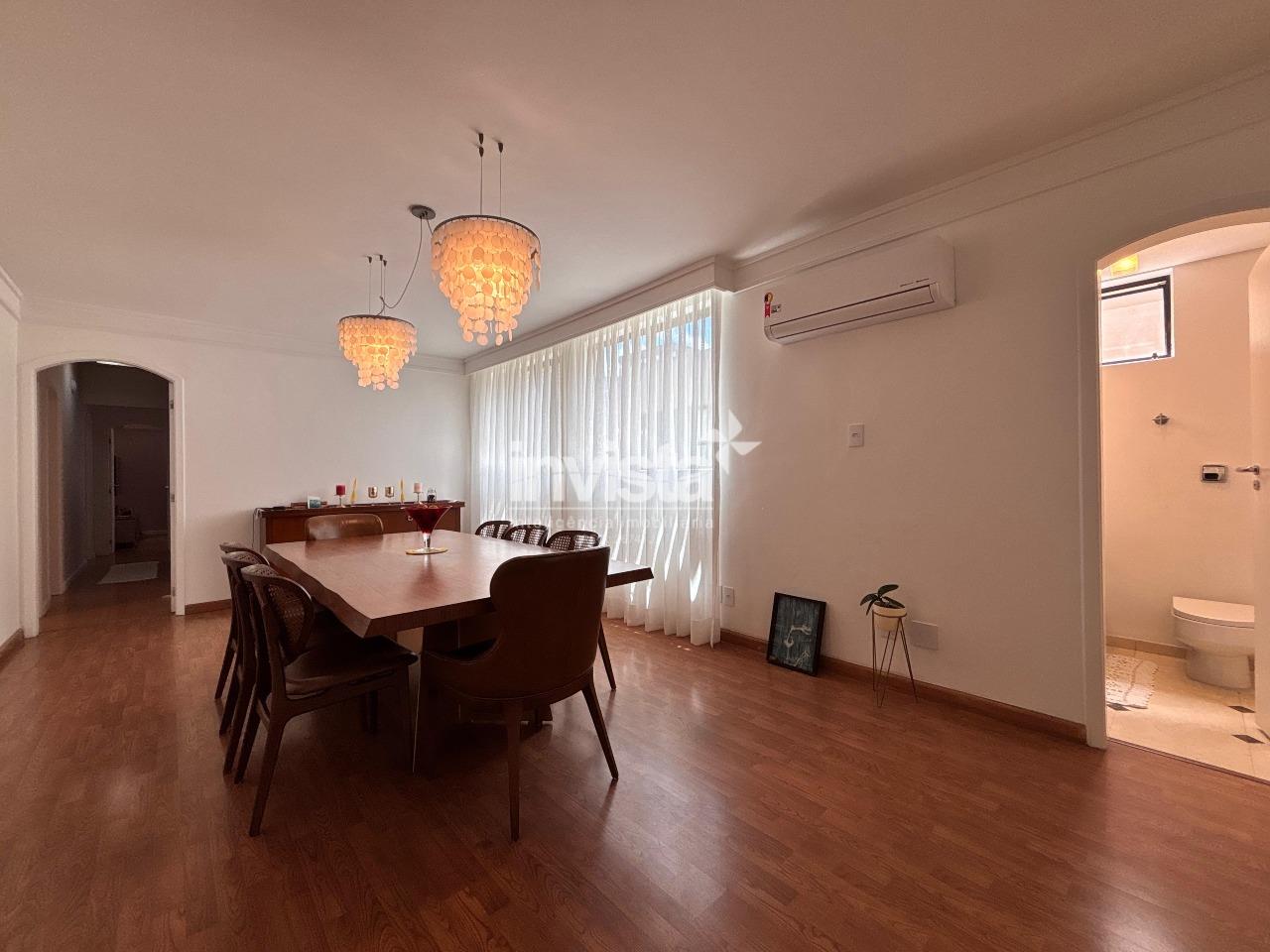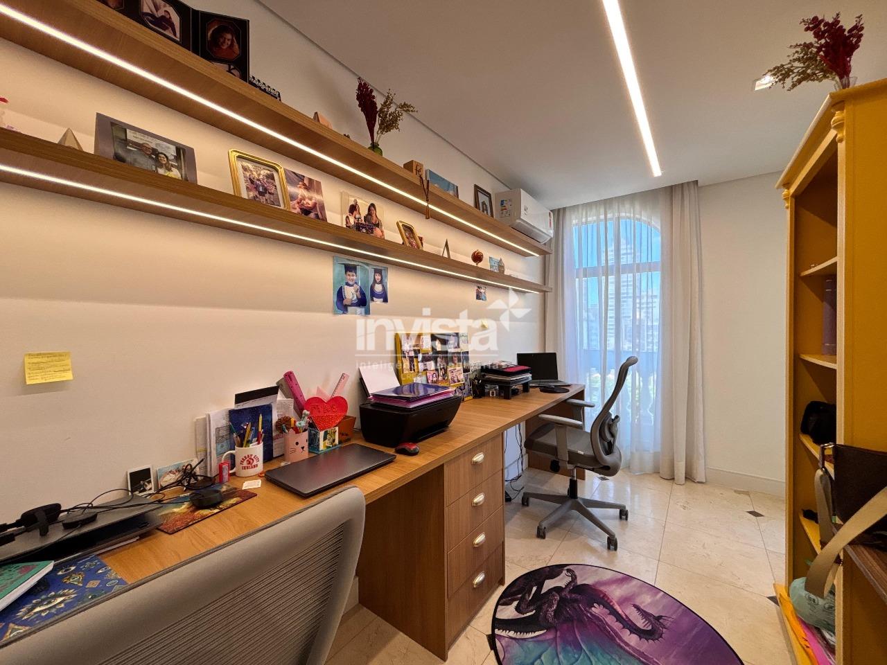 São 277,54m² úteis, com hall de elevador privativo, sala 3 ambientes com piso em mármore italiano, escritório montado em drywall integrado à varanda com vista mar, 4 dormitórios (2 suítes, uma com closet e banheira), além de dependência completa.