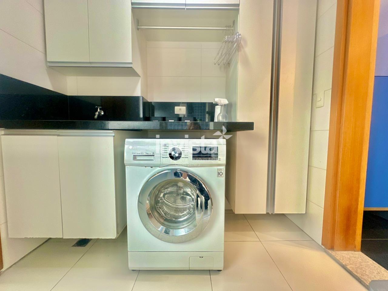 A cozinha tem ótimo tamanho, marcenaria planejada de excelente padrão, revestimentos alegres e eletrodomésticos de qualidade. Ao lado, a lavanderia conta com banheiro de serviço e acesso a um terraço com área técnica.