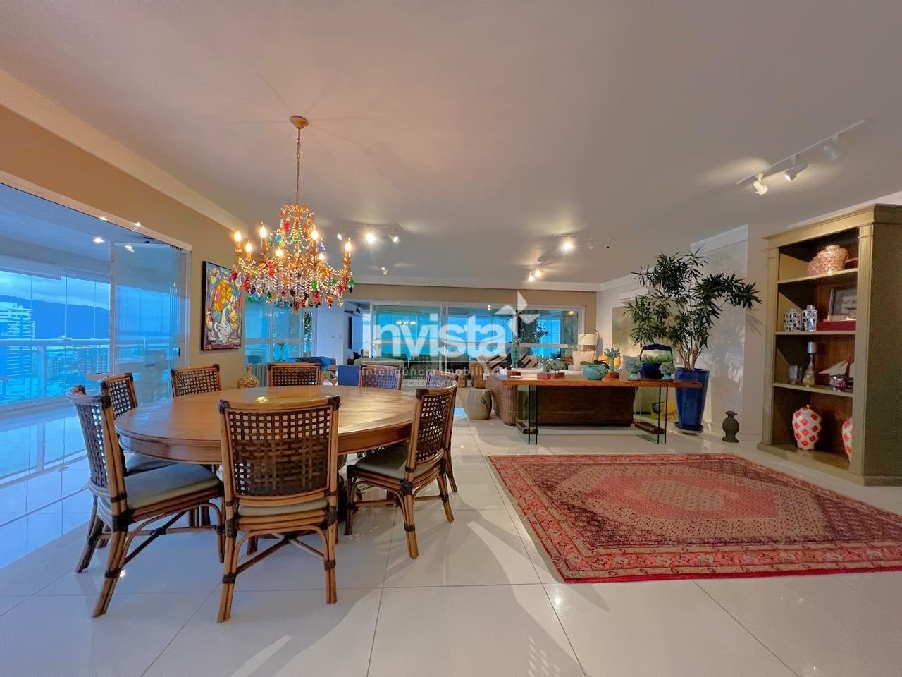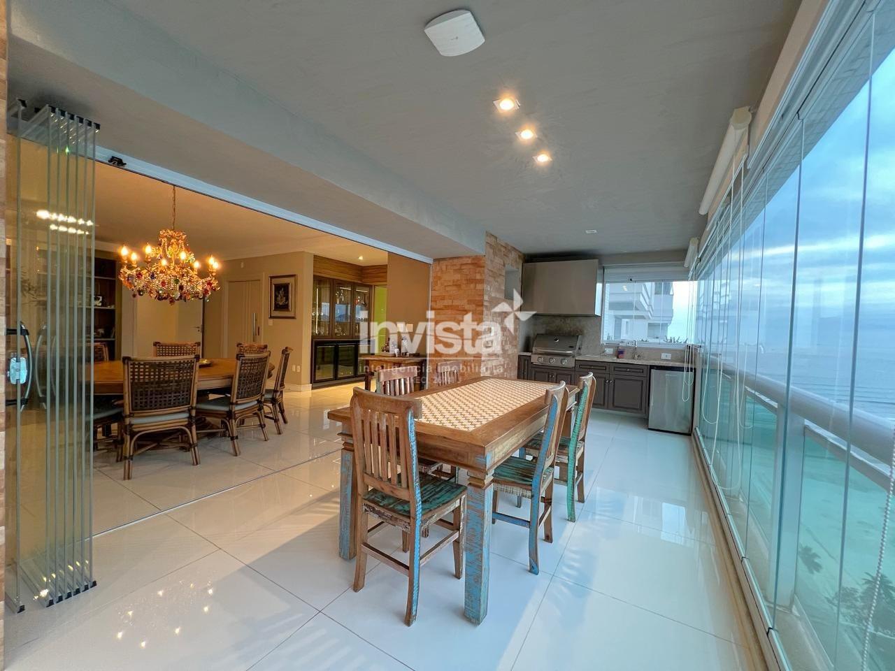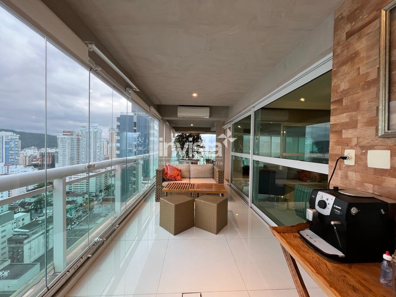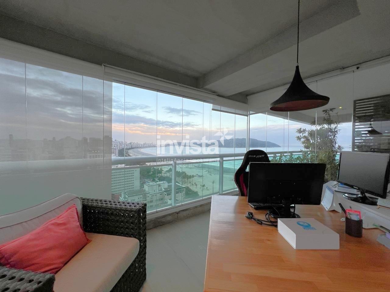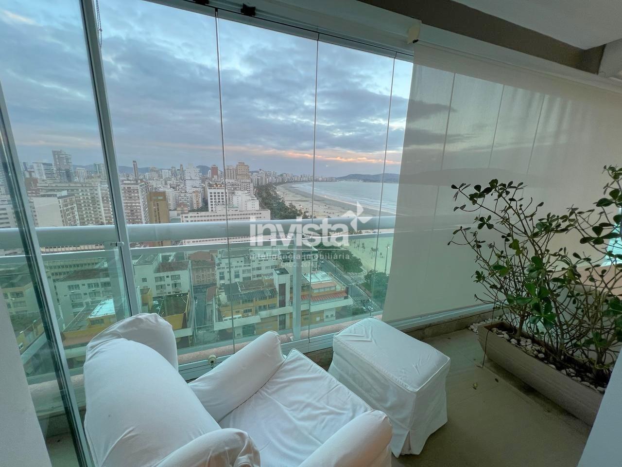Apartamento luxuoso, em prédio de Alto Padrão no Gonzaga em frente a praia com vista cinematográfica para Orla de Santos, tanto para o Norte como para o Sul, varanda com mais de 100 metros² em volta de todo o apartamento, e todos os ambientes com vista para a praia.