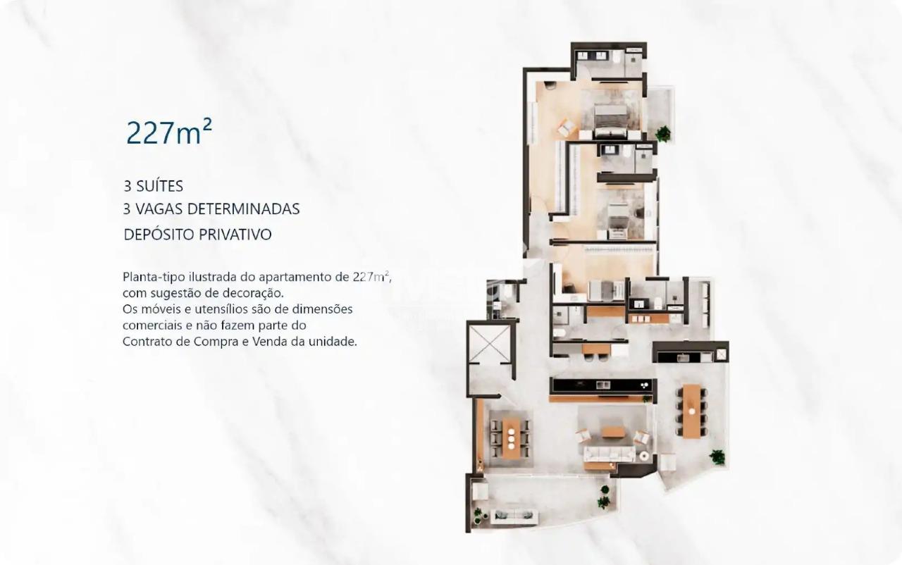 O apartamento conta com uma planta funcional de 227 m², distribuídos em 3 suítes, ampla varanda gourmet e 3 vagas de garagem demarcadas.
