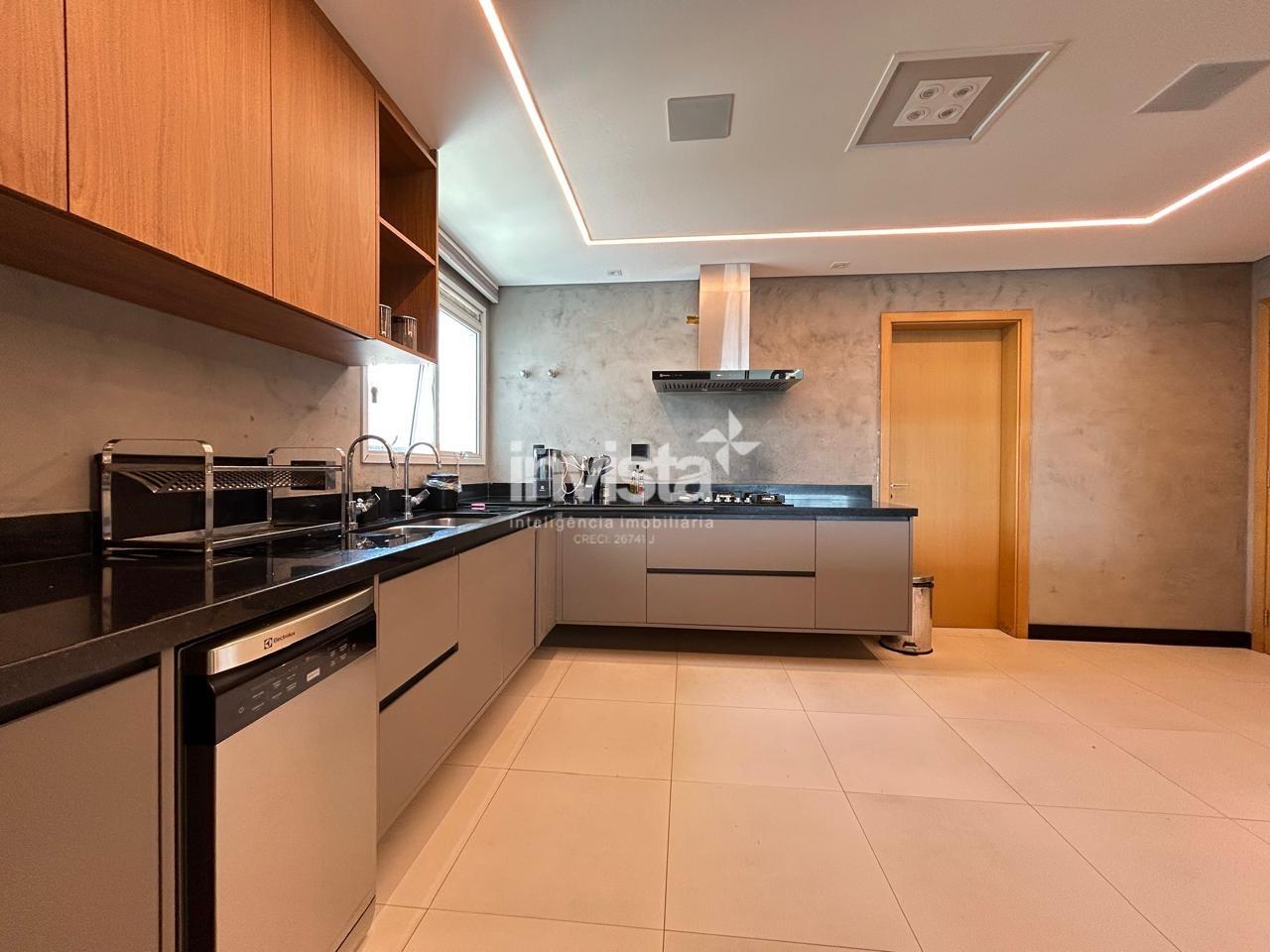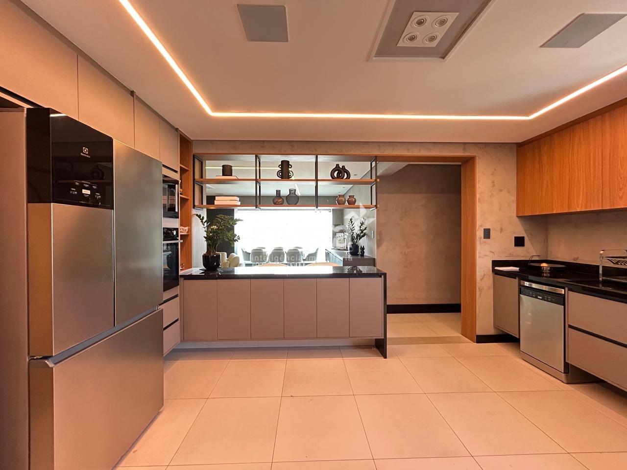 Cozinha planejada e equipada com eletrodomésticos, área de serviço com suíte, varanda técnica e duas vagas de garagem demarcadas.