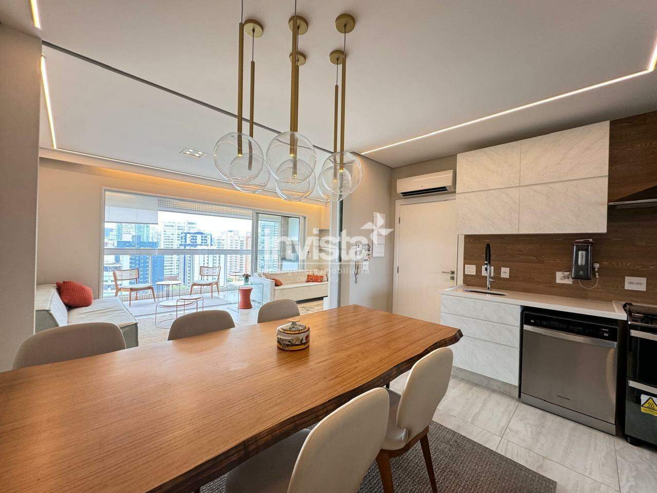 O apartamento está todo com moveis planejados de primeira linha e ar condicionado em vários ambientes .
