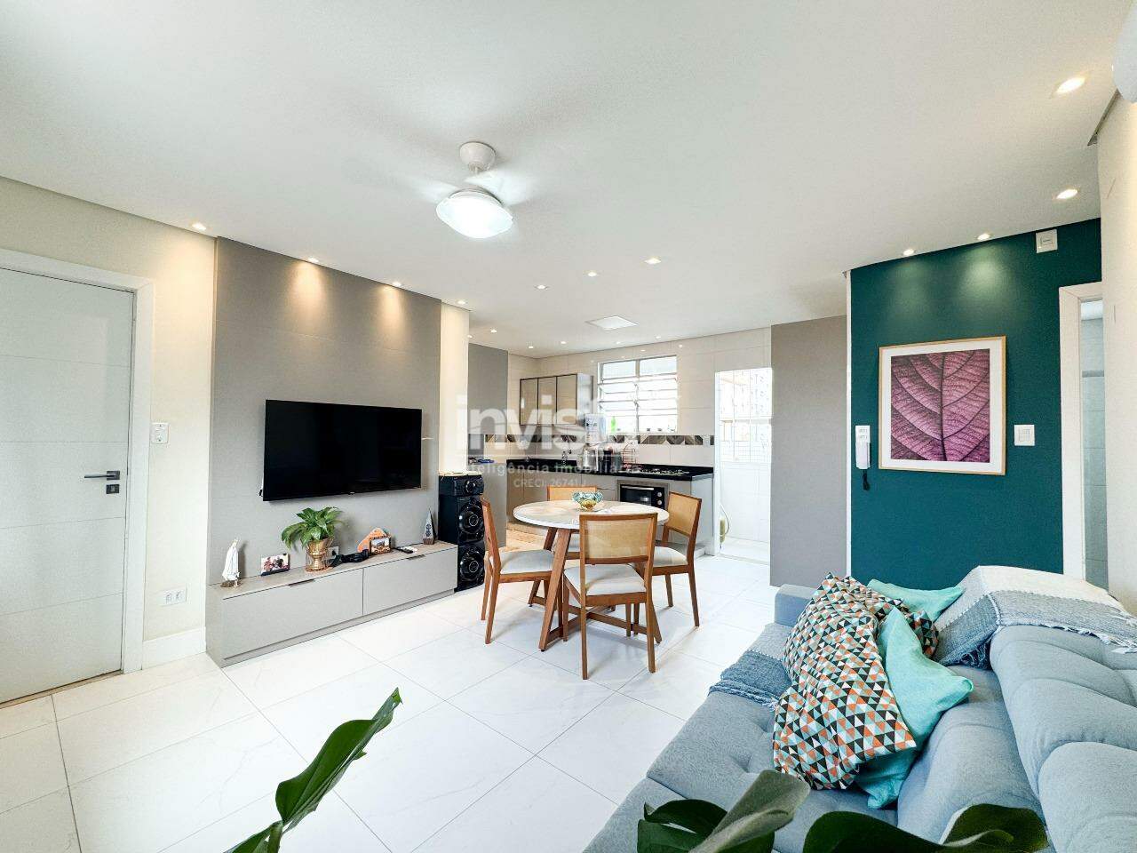 A sua sala é para 2 ambientes, com ar-condicionado, e foi integrada com a cozinha, ampliando o espaço com muito conforto. Os tons se complementam, e tudo fica assim, lindo demais!