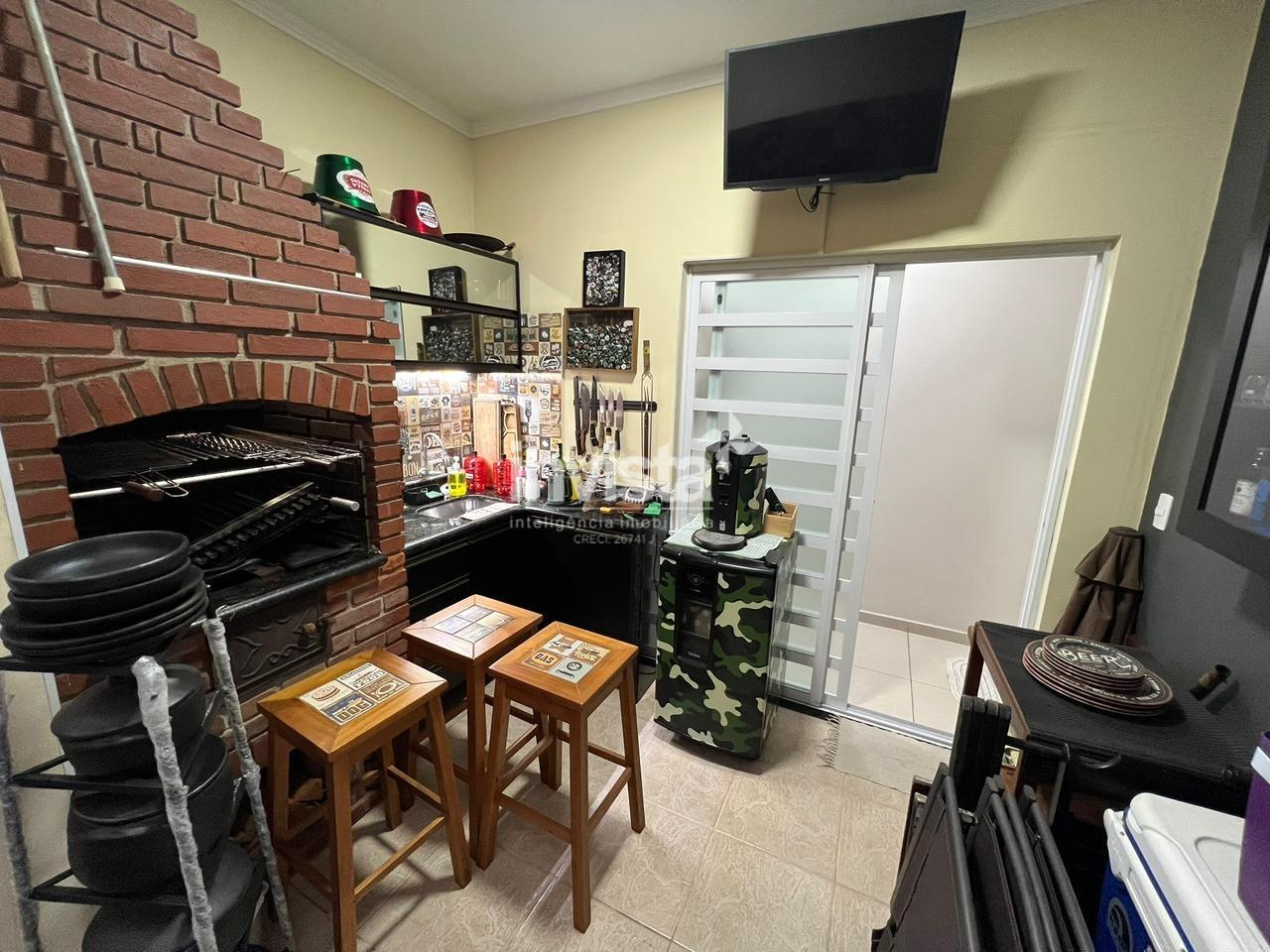 A casa ainda conta com um espaço gourmet com churrasqueira, ideal para reunir família e amigos, além de uma cozinha funcional com armários planejados. A área de serviço é completa, com despensa e banheiro de apoio, garantindo praticidade total.