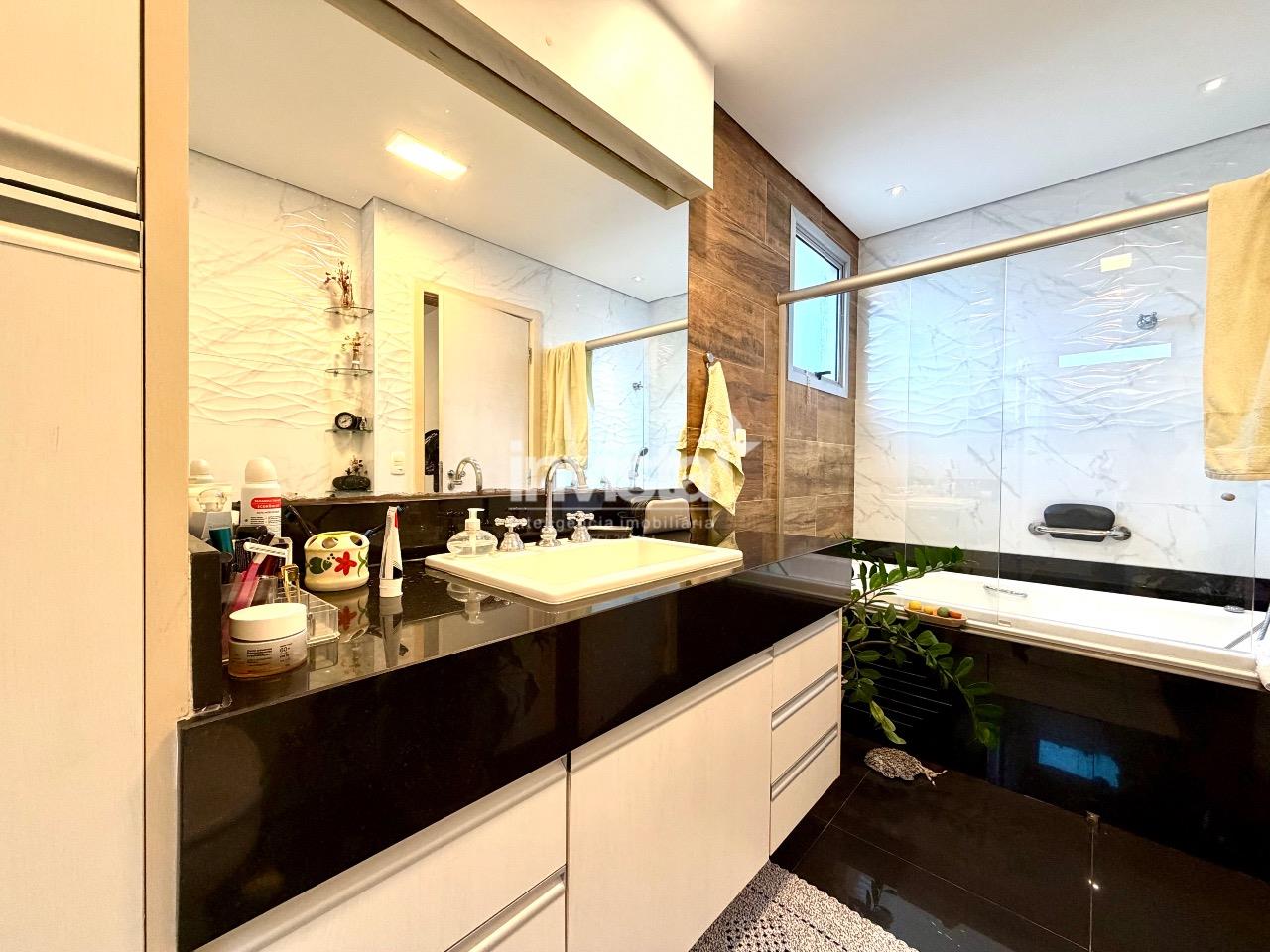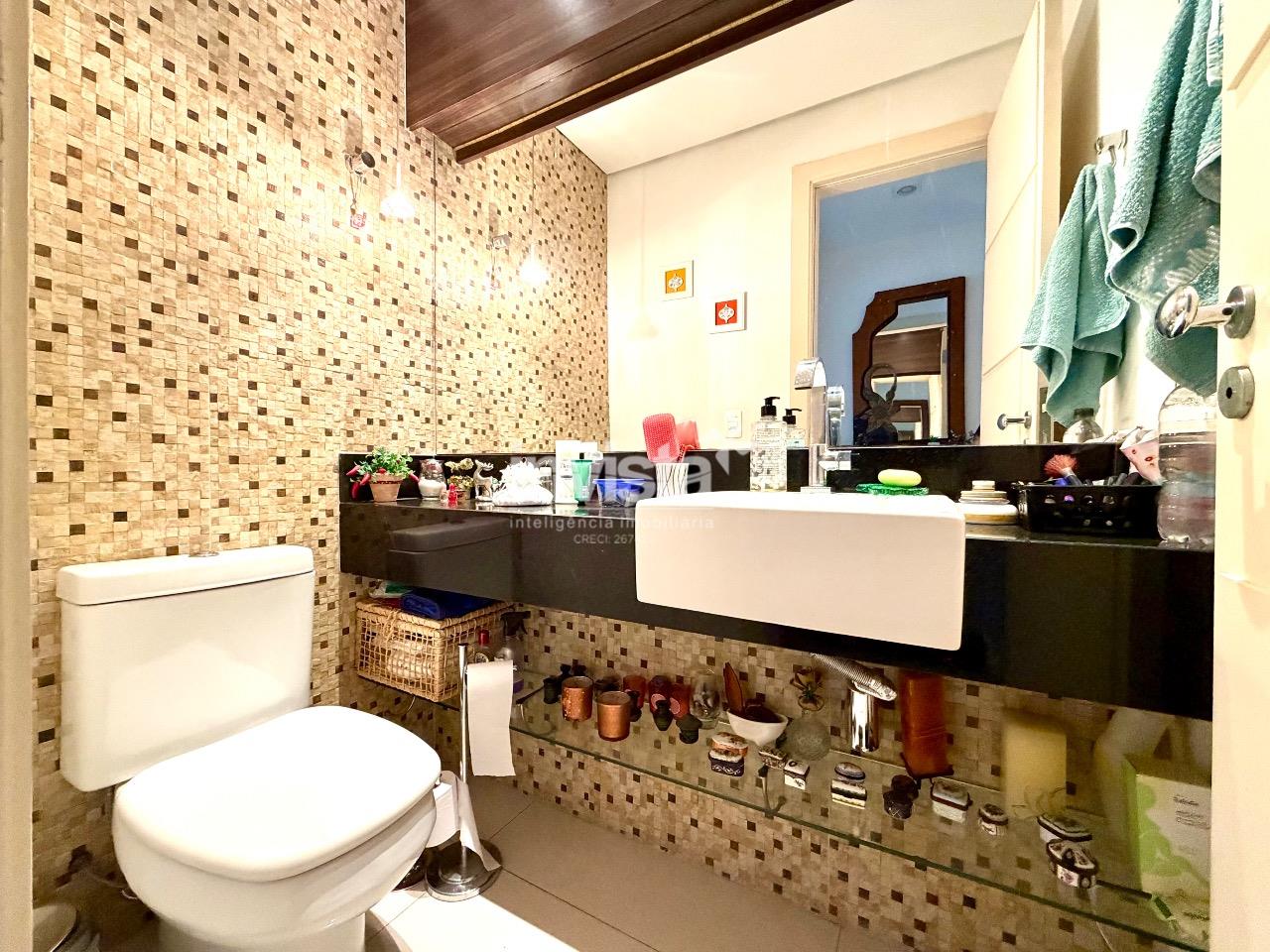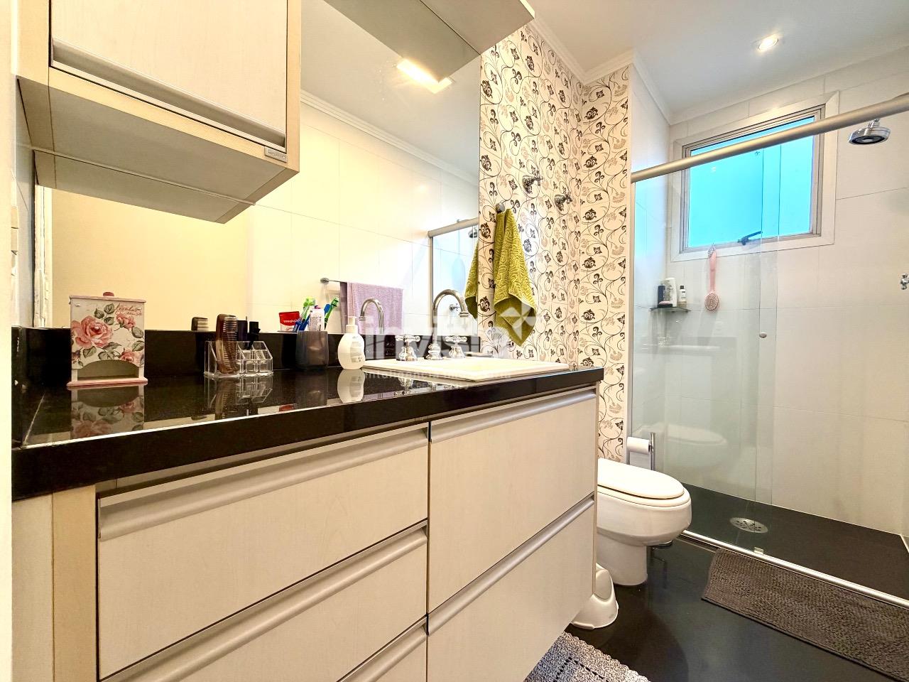 O apartamento possui três dormitórios, sendo uma suíte generosa com closet. O banheiro da suíte é um verdadeiro destaque, com banheira e ótimo espaço, trazendo conforto e funcionalidade ao dia a dia. Há ainda banheiro social bem dimensionado, lavabo e escritório.
