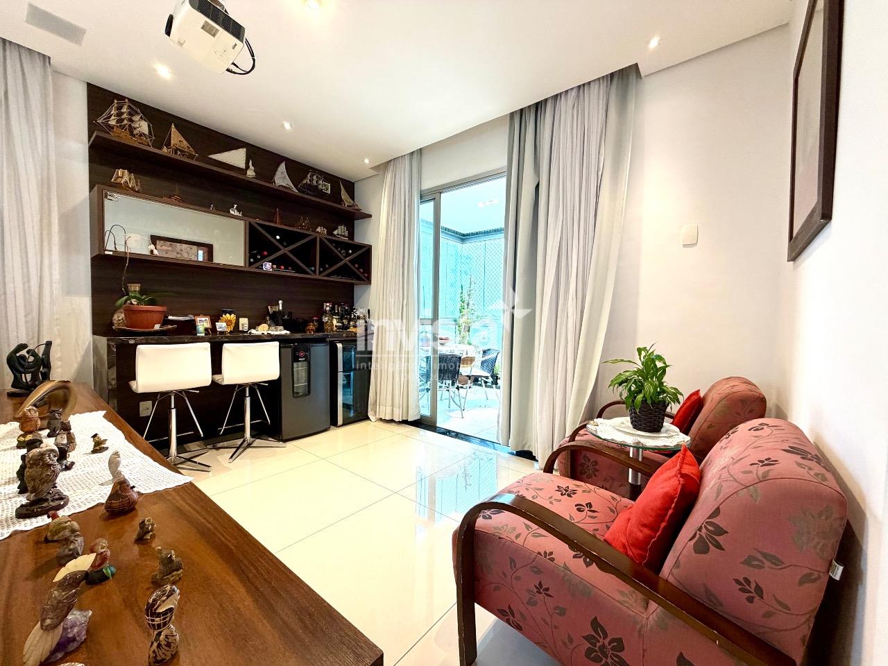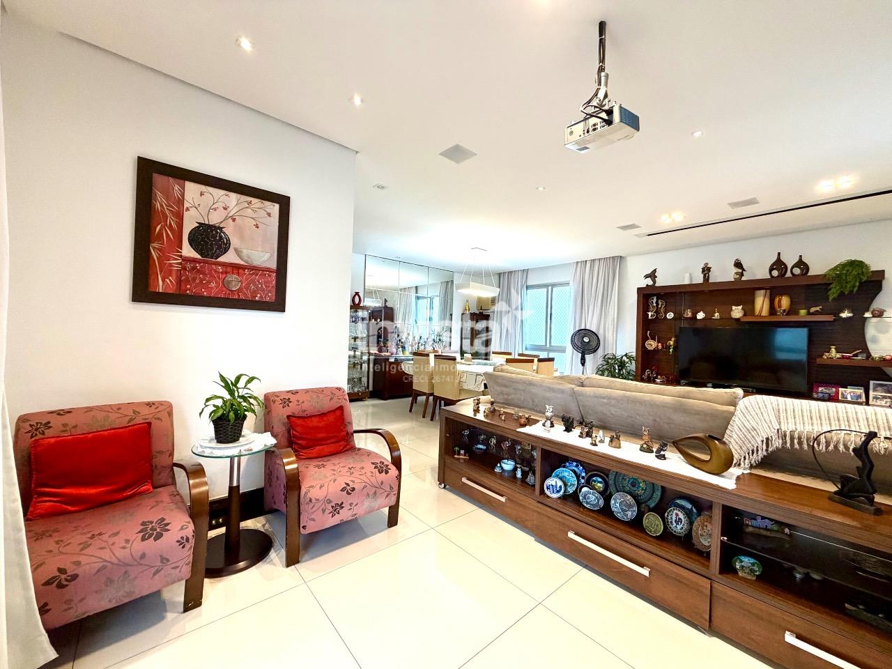A sala ampla comporta três ambientes com facilidade, ideal para receber, e já conta com projetor e telão, criando um espaço perfeito para convivência e entretenimento. A varanda, equipada com churrasqueira a gás e fechamento em vidro, se integra naturalmente à área social e oferece uma vista agradável e permanente.
