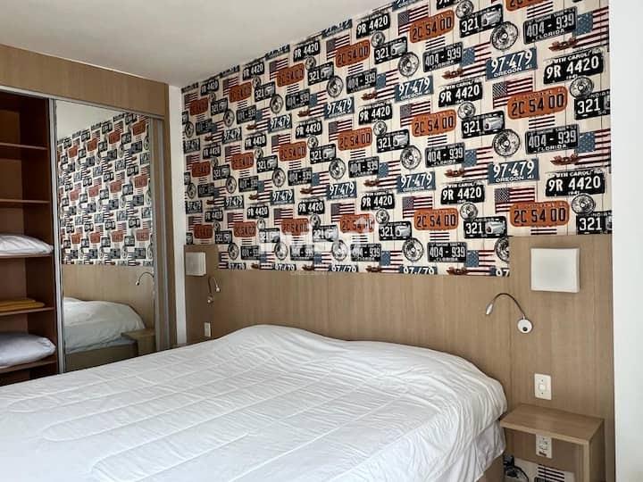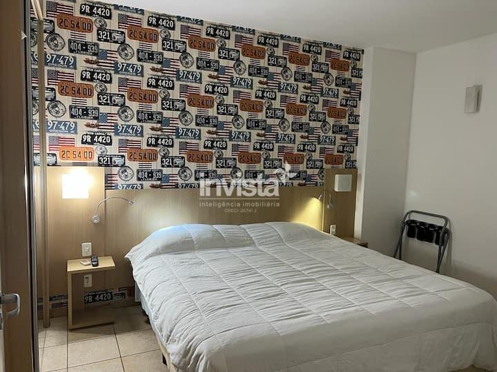 100% mobiliado, com ar-condicionado, armários no quarto e banheiro, box no banheiro, sol da manhã e vista para o mar.